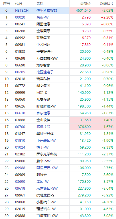 华盛资讯2月3日消息,恒生科技指数早盘低开低走,现报4601.64点,跌幅2.02%。商汤-W领涨2.2%,