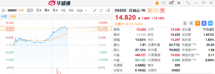 2月3日讯,百融云-W(06608)午后继续走高,午盘初升约13%,创21年10月以来新高,本周股价累升约35%。机构最新点评称,公司本轮回暖行情受益于三重因素共同催化。料23年业绩仍然维持高增长,存在超预期可能。上调评级至“买入”。截至发稿,百融云涨12.86%,报14.92港元,成交额0.80亿港元。