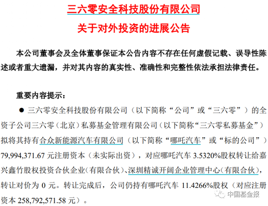 当时,三六零宣布其全资子公司三六零私募基金拟将其持有哪吒汽车3.53%股权转让给嘉兴鑫竹股权投资合伙企业(有限合伙)、深圳精诚开阔企业管理中心(有限合伙),转让对价为0元。转让完成后,三六零仍持有哪吒汽车11.43%股权。