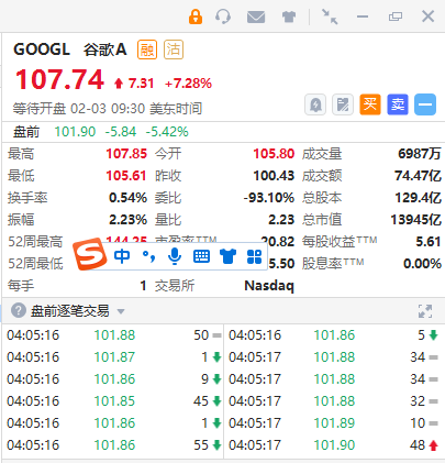 谷歌A盘前跌超5%,Q4净利润同比下滑34%至136.24亿美元。