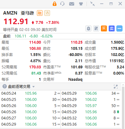 亚马逊盘前跌超6%,Q4净利润同比下降98%至2.78亿美元,云计算业务环比增速大幅放缓。