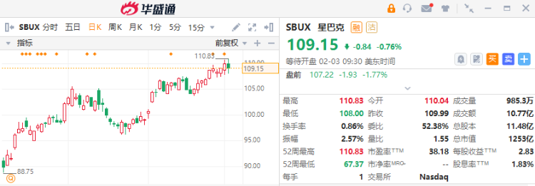 2月3日,星巴克盘前跌约2%,报106.98美元。美东时间2月2日盘后,星巴克发布截至12月31日的2023年第一财季财报,该公司营收从上年同期的80.5亿美元增至87.1亿美元,低于市场预期的87.9亿美元。第一财季,星巴克全球同店销售额增长了5%,但中国同店销售额下降了29%,国际业务的同店销售额整体下降了13%。