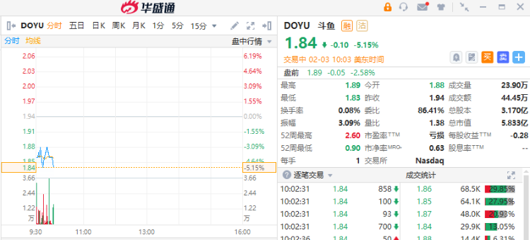 中概直播概念股齐挫,斗鱼跌超5%,虎牙跌超3%,挚文集团跌约2%。