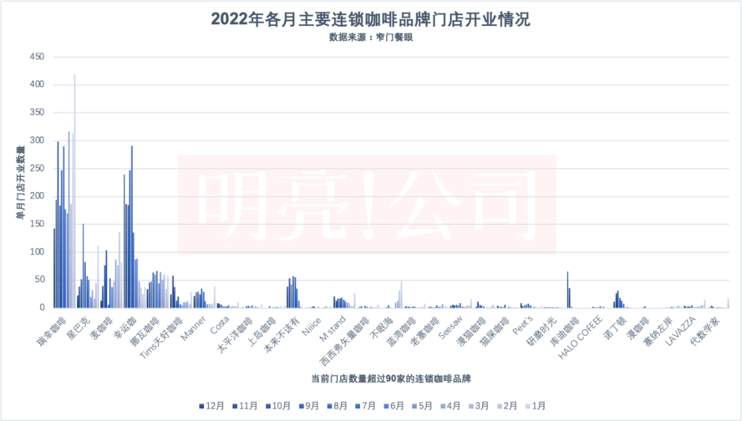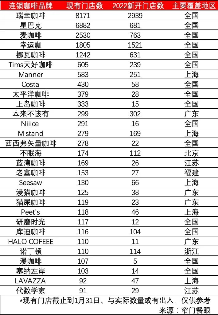 「明亮公司」还发现,截至目前,连锁咖啡品牌(不含奶茶)门店数量超过90家的共有29家,合计咖啡店数量25941家,其中前10家品牌合计22960家、前5家品牌合计20630家。据华经产业研究院,中国咖啡馆门店数量在2022年4月约11.73万家,按此数量计算,咖啡门店数量前五位的品牌占市场门店总数的16%-17%,前十位占18%-19%。