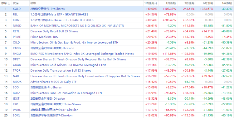 从ETF涨幅榜来看,2倍做空天然气-ProShares $KOLD 本周大涨40%居榜首,个股杠杆ETF表现也很亮眼,1.5倍每日做多Meta ETF - GRANITESHARES $FBL 周涨34.36%,1.5倍每日做多Coinbase ETF - GRANITESHARES周涨30.54%,近一月已经累计大涨超200%。