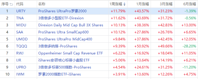 股指ETF方面,本周涨幅居首的是ProShares UltraPro罗素2000 $URTY ,全周收涨11.79%,近一个月涨幅为43.57%。第二名仍是做多小盘股ETF,周涨幅达11.62%。Direxion Daily Mid Cap Bull 3X Shares跟ProShares Ultra SmallCap600均涨超10%。科技股近期大幅反弹,3倍做多纳指-ProShares近一个月涨幅为50.92%。