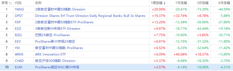 做空新兴市场的相关ETF本周也表现较好,3倍做空新兴市场ETF-Direxion周涨9.97%,ProShares新兴市场2X做空周涨6.91%。