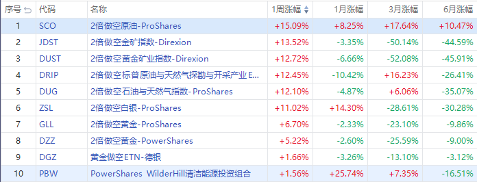 商品ETF方面,2倍做空原油-ProShares $SCO 周涨15.09%排名第一,2倍做空石油与天然气指数-ProShares周涨12.10%。