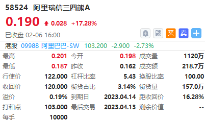 看好可留意阿里购 $22613.HK ,行使价110.10港元,23年5月到期。相反看淡则可留意阿里熊 $58524.HK ,收回价120.00港元,行使价122.00港元,23年4月到期。
