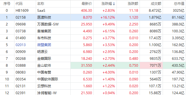 华盛资讯2月9日消息,港股Saas概念股午后走高。截至发稿,医渡科技涨超16%,股价现报8.07港元,成交额1.88亿港元;万国数据-SW涨9.49%,报25.95港元每股,阜博集团涨超6%,中国有赞涨4%,微盟集团涨3.53%,明源云、金蝶国际、金山软件涨逾2%。