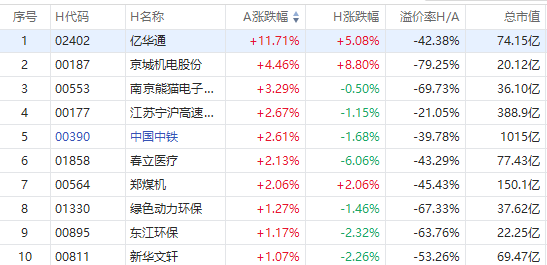 截至发稿,亿华通A股涨11.71%,H股现涨5.08%;京城机电股份A股涨4.46%,H股涨8.8%;中国中铁A股涨1.17%,H股跌1.68%。