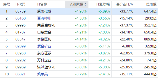 康龙化成A股跌4.98%,H股涨跌5.89%;百济神州A股跌4.3%,H股跌3.56%;万科企业A股跌3.84%,H股跌4.21%。