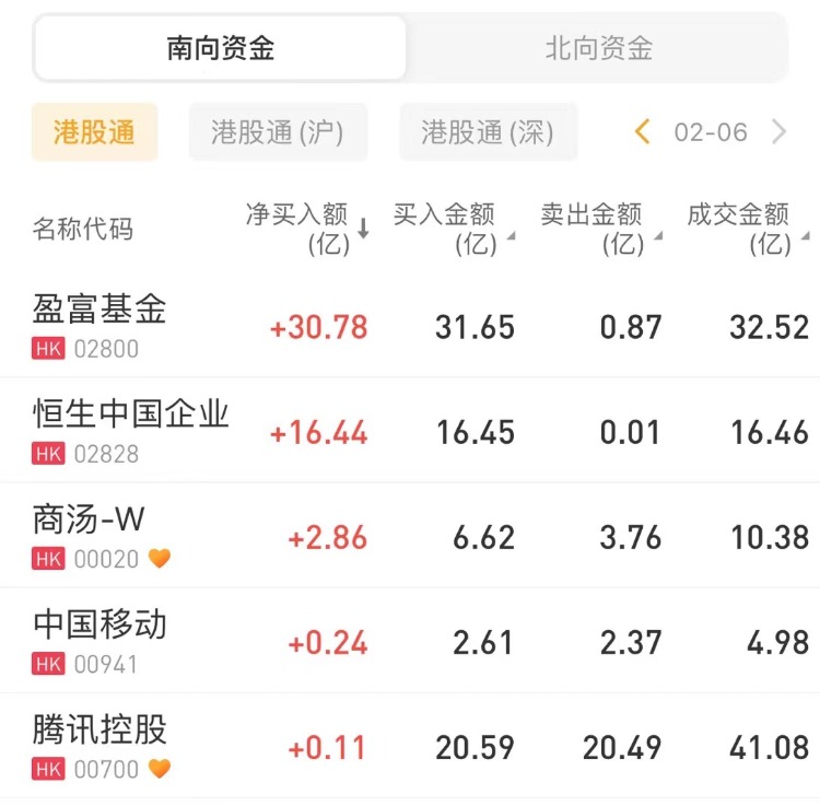 盈富基金、恒生中国企业、商汤-W分别获净买入30.78亿港元、16.44亿港元、2.86亿港元;
