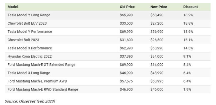 福特最近因宣布Mustang Mach-E电动SUV降价,该车型是特斯拉畅销车Model Y的直接竞品。雪佛兰和现代汽车最近几个月也调整了部分电动汽车价格,如下表所示。