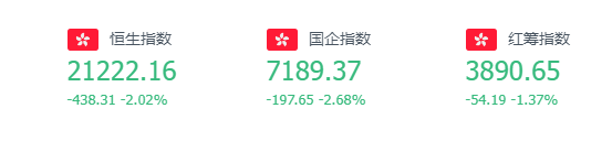 截至周一收盘,恒生指数跌2.02%或438.31点,报21222.16点,全日成交额1360.20亿港元;恒生国企指数跌2.68%,报7189.37点;恒生科技指数跌3.65%,报4464.82点。