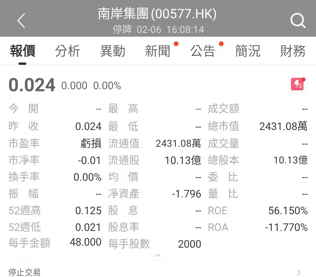 南岸集团于2021年6月22日停牌,截至停牌时,南岸集团的总市值约0.24亿港元。