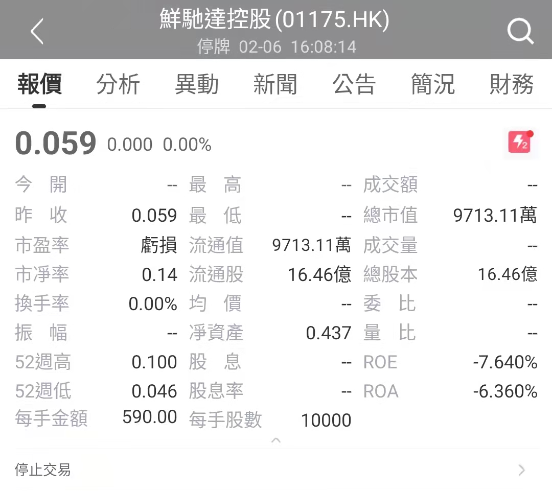 鲜驰达控股于2021年7月2日停牌,截至停牌时,鲜驰达控股的总市值约0.97亿港元。