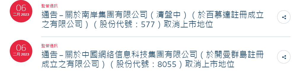 昌兴国际控股(00803.HK)鲜驰达控股(01175.HK)南岸集团(00577.HK)中国网络信息科技集团(08055.HK)这四家上市公司将由2023年2月9日,上市地位将予以取消。