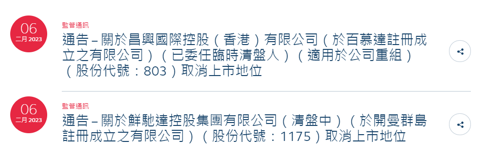 聯交所宣布,由2023年2月9日上午9時起,該公司的上市地位將根據《上市規則》第6.01A(1)條予以取消。