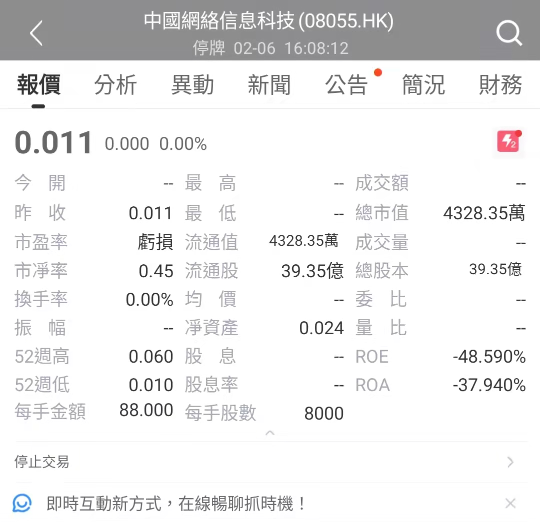 中國網絡信息科技集團有限公司于2021年12月30日停牌,截至停牌时,中國網絡信息科技集團有限公司的总市值约0.43亿港元。