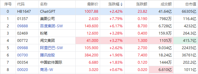 盘面上,美图公司涨7.79%领升,报2.63港元每股;粉笔、阅文集团涨超3%,阿里、腾讯、商汤跟涨。