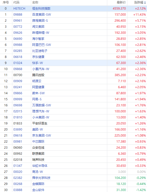 百度 $09888.HK 官宣ChatGPT产品,股价大涨11%领衔科技股,携程 $09961.HK 涨超5%,阅文集团 $00772.HK 、哔哩哔哩 $09626.HK 涨超3%,阿里巴巴 $09988.HK 、快手 $01024.HK 、海尔智家 $06690.HK 、腾讯控股 $00700.HK 等涨超2%