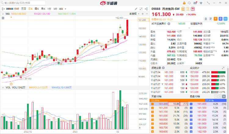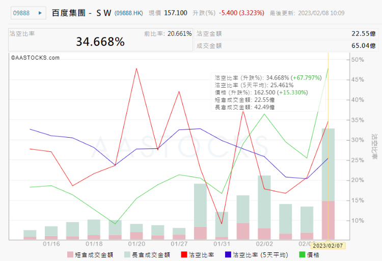 值得注意的是,百度沽空力量激增。2月7日,港交所沽空成交数据显示,百度集团-SW沽空比率增至34.668%,前5日平均沽空比率为25.46%,沽空金额22.55亿港元。