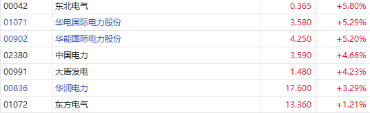 2月8日消息,港股电力股持续强势。截至发稿,东北电气涨5.8%,华能国际电力股份涨5.2%,报4.25港元每股,成交额1.8亿港元;华电国际电力股份涨5.29%,中国电力涨4.66%,大唐发电、华润电力等跟涨。