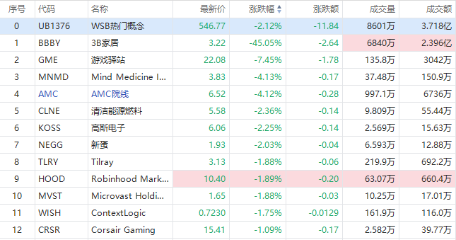 华盛资讯2月7日消息,美股WSB概念股盘初集体走低,截至发稿,3B家居跌超45%盘初触发熔断,游戏驿站现跌超7%,AMC院线跌超4%,高斯电子跌超2%。