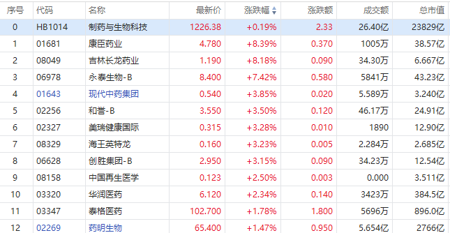 截止发稿,A股华润三九、科伦药业涨超3%,泰格医药、华东医药等跟涨,港股生物医药股永泰生物涨超7%,亚盛医药、云顶新耀涨超4%,和誉、华领医药等跟涨。