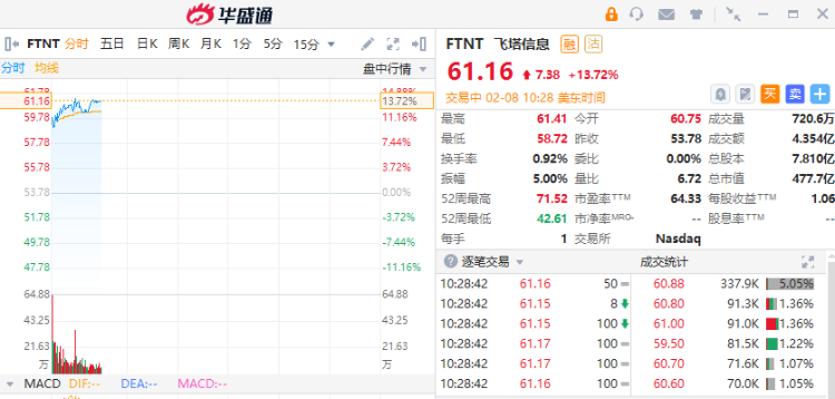 2月8日,飞塔信息现涨13.72%,报61.16美元。公司2022年第四季度收入12.8亿美元,同比增长33%,预期12.9亿美元;净利润为3.14亿美元,同比增长60%;调整后EPS为0.44美元,预期0.39美元。