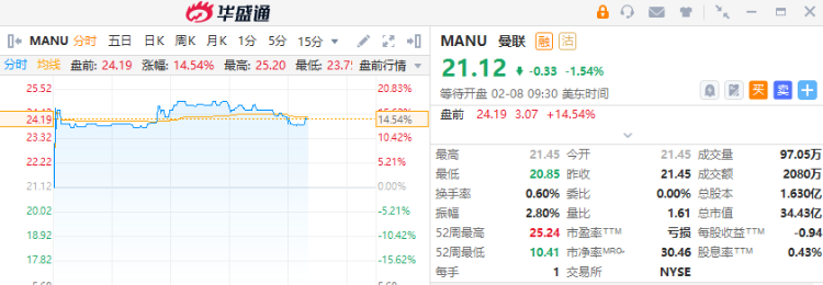 值得一提的是,去年11月大涨的主要原因,正是球队老板格雷泽家族确认将评估出售事宜。为了潜在的出售交易,美国老板也请来罗斯柴尔德银行担任财务顾问。若今日收盘价能维持在25美元附近,也将刷新公司自2018年后的股价新高。