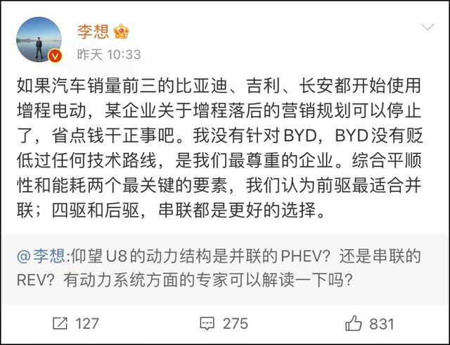 他进一步解释称自己并非针对比亚迪,因为比亚迪“没有贬低过任何技术路线,是我们最尊重的企业”。此前,李想曾通过微博提问比亚迪“百万级车型”仰望U8的动力结构是并联还是串联。李想认为,综合平顺性和能耗两个关键要素,前驱适合并联;而四驱和后驱,串联都是更好的选择。