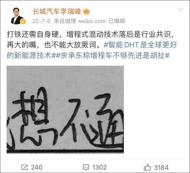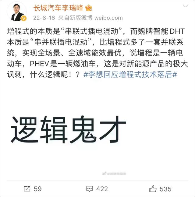 此言一出,时任长城魏牌CEO李瑞峰连发数条微博批判,称“增程式混动技术落后是行业共识,再大的嘴,也不能大放厥词”,并带上了#智能DHT是全球更好的新能源技术##余承东称增程车不够先进是胡扯# 等标签以引发网友讨论。