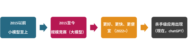 在2015年,AICG主要以小模型为主,数据量小。2015至今就开始了规模竞赛,各个行业的龙头都在推大模型,竞赛促成大模型逐渐成熟,算力不断扩展,直至出现一个杀手级的应用作为引爆点。比如前几年的智能手机行业,苹果推出智能手机引爆了整个智能手机的行业,后又推出Airpods又引爆了智能耳机行业。这说明即使模型再好技术再成熟,没有一个现象级的产品出现,很难引发需求。
