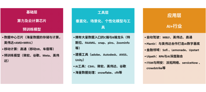 如果说第一阶段炒的是概念,那第二阶段更多的就是炒技术实力,更成熟的技术更低的成本才是第二阶段的核心竞争力。为了方便给大家梳理投资机会,言财老师将AI分为3个层次,基础层,工具层以及应用层。