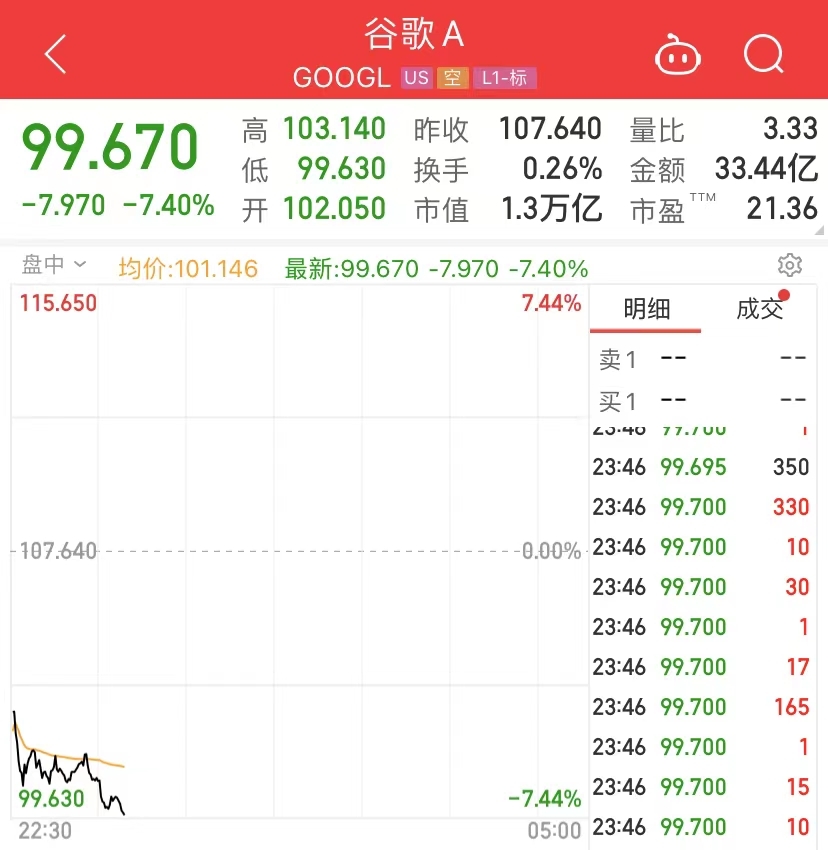 谷歌大跌超7%,市值蒸发约1020亿美元(约6932.50亿元人民币)。此前谷歌人工智能聊天机器人Bard在一场发布会上对用户提出的问题给出错误回答。