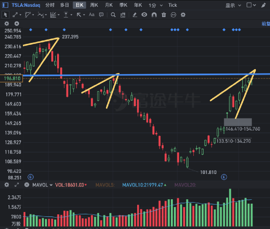 特斯拉股价上个交易日收涨1.05%,报196.81元,市值为6214.77亿美元,成交额为361.09亿美元。