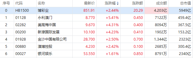 华盛资讯2月9日消息,博彩股早盘上扬,截至发稿,永利澳门涨超5%,报8.77港元每股;美高梅中国涨4.31%,新濠国际发展涨超4%,金沙中国有限公司涨超2%,澳博控股、银河娱乐跟涨。