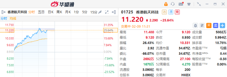 华盛资讯2月9日消息,港股香港航天科技盘中大幅大涨一度涨超27%,月内累涨超90%。截至发稿,该股涨25.64%,报11.22港元,成交额6亿港元。
