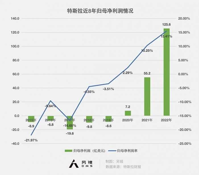 值得一提的是,特斯拉自2017年起,连续六年利润率不断攀升,2022年利润率15.41%;业绩在2020年开始大幅扭亏为盈,2020年归母净利润7.2亿美元,2022年归净利润迅速增长至125.6亿美元。