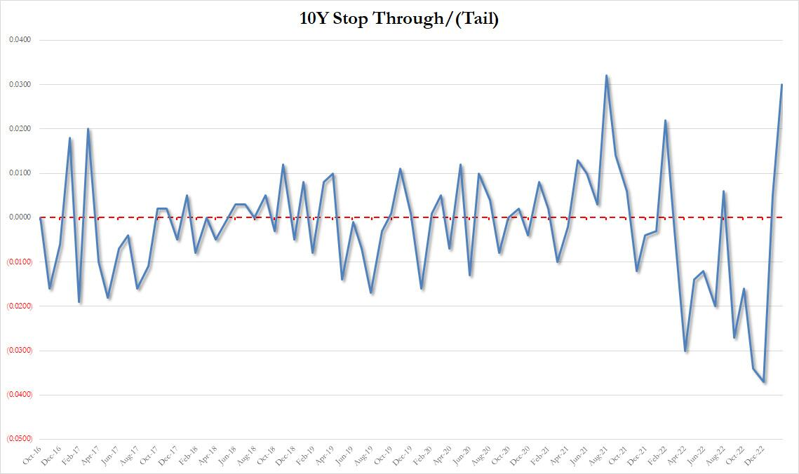 事实证明,投资者的看法是对的,因为美国财政部周三又拍卖了价值350亿美元的10年期美债,最终得标利率3.613%,跟上次得标利率3.575%相比大幅提高,不过跟发行时的3.643%相比有所下降。另外,投标倍数达到2.66,高于上一次的2.53,这也是自去年2月22日以来最高的水平。