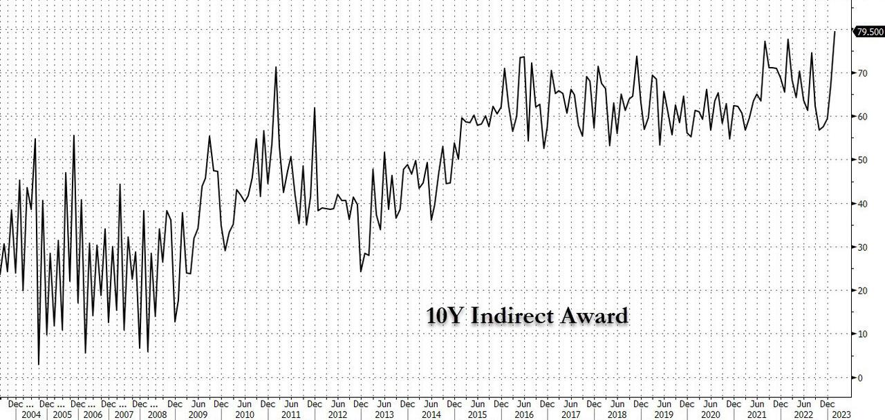 过去几年包括央行、私人投资者和主权财富基金等间接竞标者占比持续上升,1月份甚至从67%飙升至79.5%,为有记录以来的最高水平。相比之下,直接竞标者,即自有账户竞标的机构或个人,包括一级交易商、对冲基金、养老基金、共同基金、保险公司、银行、政府机构和个人等的占比则从上个月的17.9%降至15.2%。