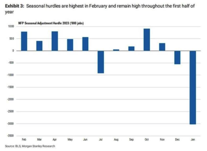 摩根士丹利的经济学家指出,1月份的数据反映了三个它认为是暂时的因素:异常温暖的天气、加州高等教育罢工的解决以及非常强劲的季节性调整推动。他们在周二晚些时候发表的一份报告中表示:”季节性影响是一年中的零和博弈,因此,今年上半年就业疲软很可能会抵消1月份的上涨。“