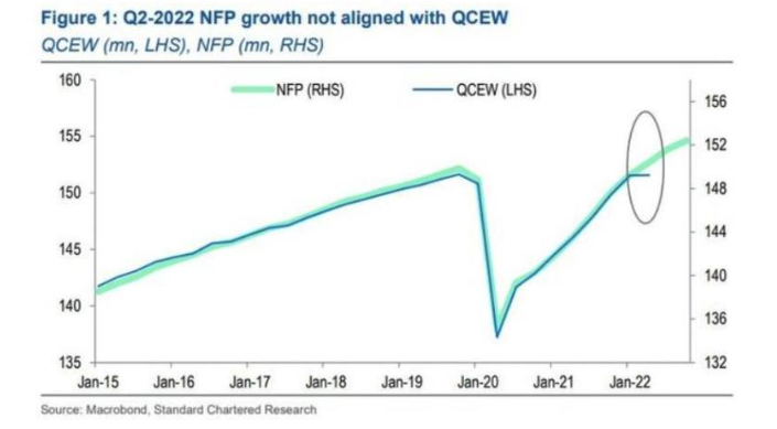 渣打银行北美宏观战略主管Steve Englander 深入研究了美国劳工部(Labor Department)发布的另一组数据,即就业和工资季度普查。费城联储对QCEW数据的分析发现,不管是长期就业还是短期就业,2022年第二季度的就业岗位被夸大了大约100万个。