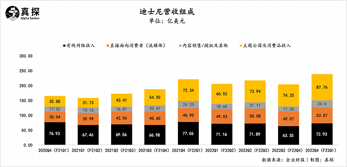 迪士尼总营收构成共包括四部分:有线网络、流媒体、内容销售/授权(原影视娱乐)、主题公园及消费品衍生。来看下各分部的财务详情: