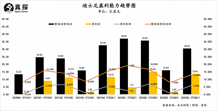 2023财年第一财季(即2022年第四季度),迪士尼营收235.1亿美元,同比增长8%,高于市场预期的233.7亿美元;实现整体经营利润30.43亿美元,同比上一财年下降7%,整体经营利润率12.94%;实现净利润13.61亿美元,净利润率5.79%;摊薄后每股收益为0.7美元,高于去年同期的0.63美元。
