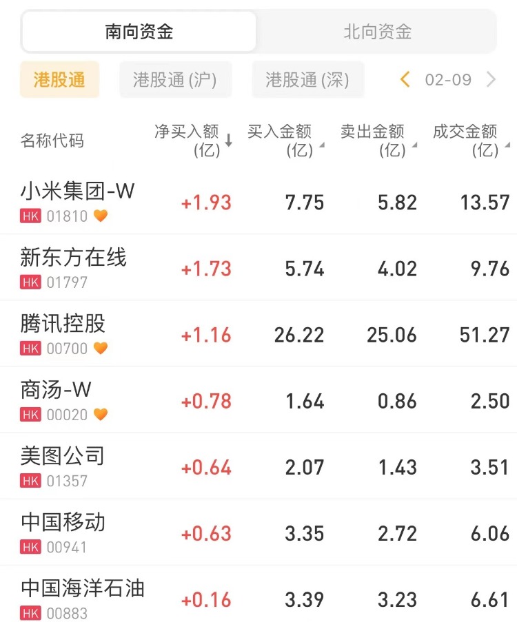 小米集团-W、新东方在线、腾讯控股分别获净买入1.93亿、1.73亿、1.16亿港元,小幅加仓商汤-W、美图公司、中国移动。