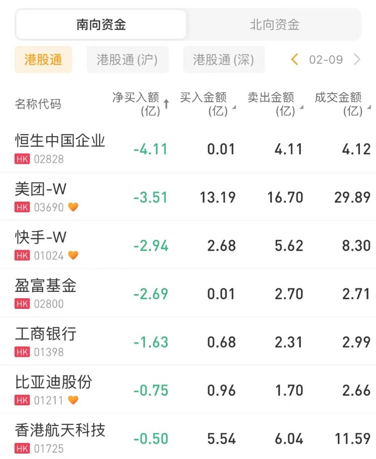 恒生中国企业、美团-W、快手-W分别遭净卖出4.11亿、3.51亿、2.94亿港元,盈富基金、比亚迪股份也遭抛售。