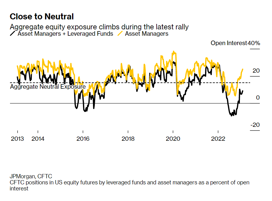 这意味着大量投资者从减持股票转向持有更接近过去十年平均水平的股票。摩根大通和德意志银行的数据显示,自去年第二季度美联储开始加息以来,投资者目前的仓位最接近中性。